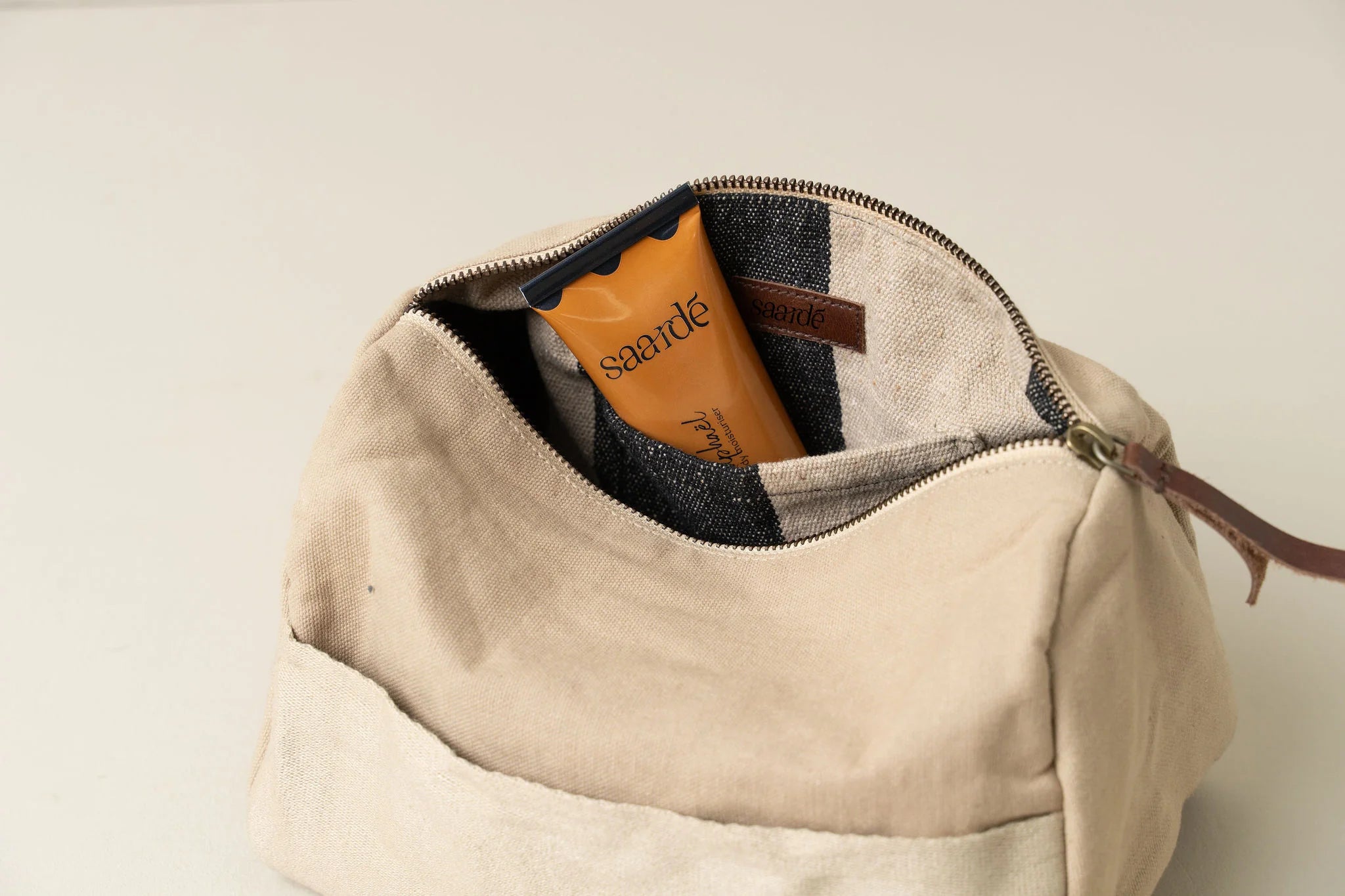 Featuring a striped woven cotton lining, genuine leather detailing and an external pocket, the Journey Toiletry bag is made to suit all your toiletry needs.