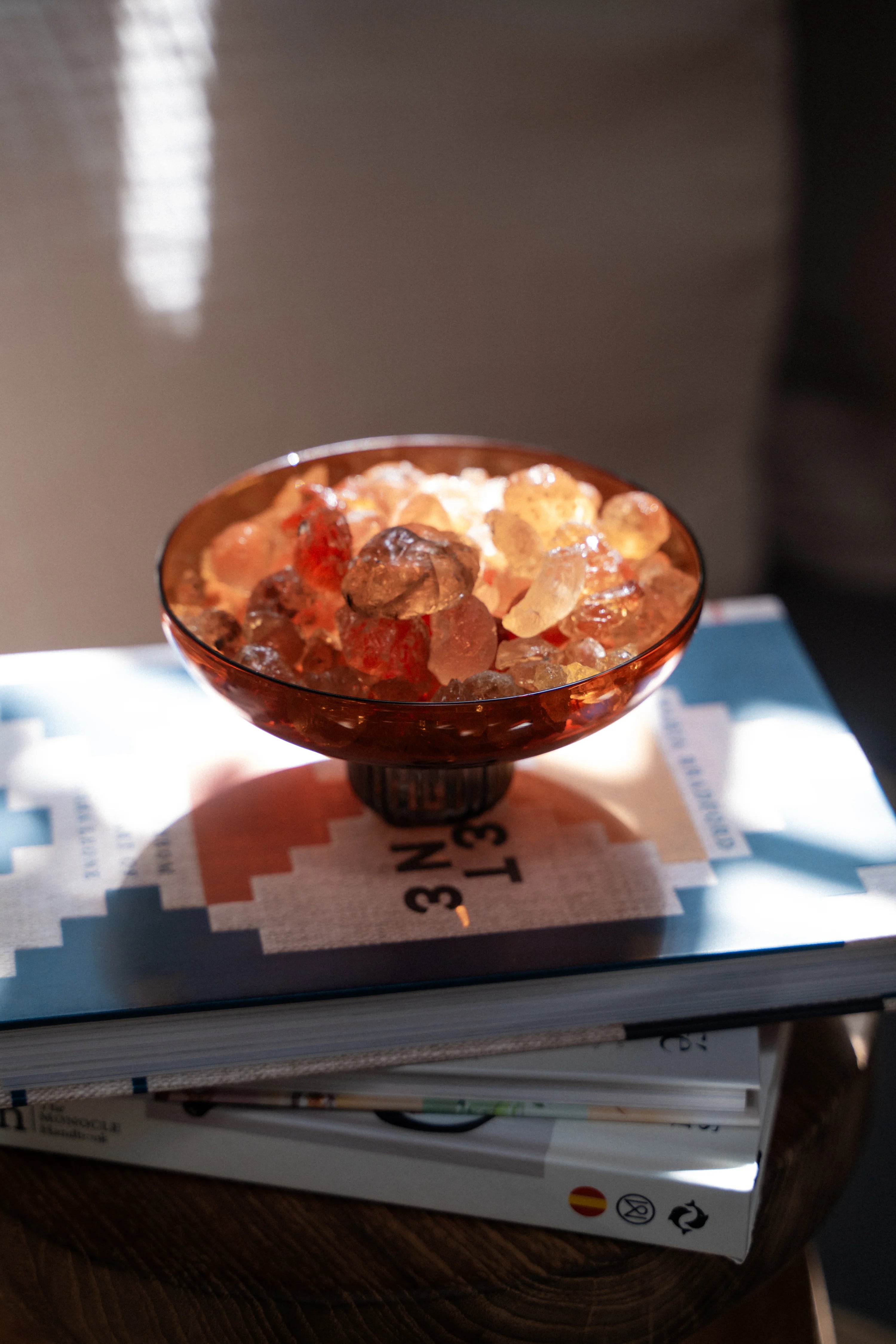Akin to an exquisite jewellery box, it is confined within a dark amber-hued glass bowl with a smoke-hued glass base. The bowl is filled with natural tree sap ambers cueing precious gemstones.